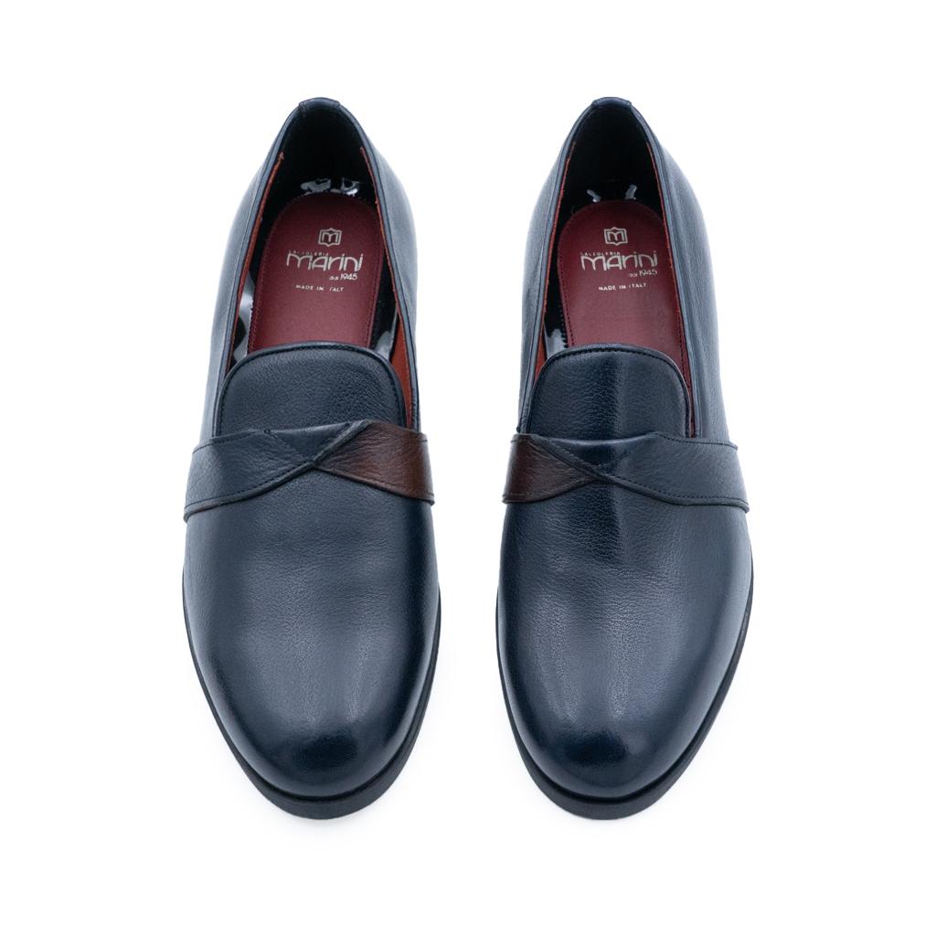 The distinctive element is the two-tone buffalo leather crossover band: blue on the outside and dark brown on the inside, which creates a refined visual contrast and a dynamic line on the instep. The blue kangaroo leather trim finishes the shoe’s profile with elegance.