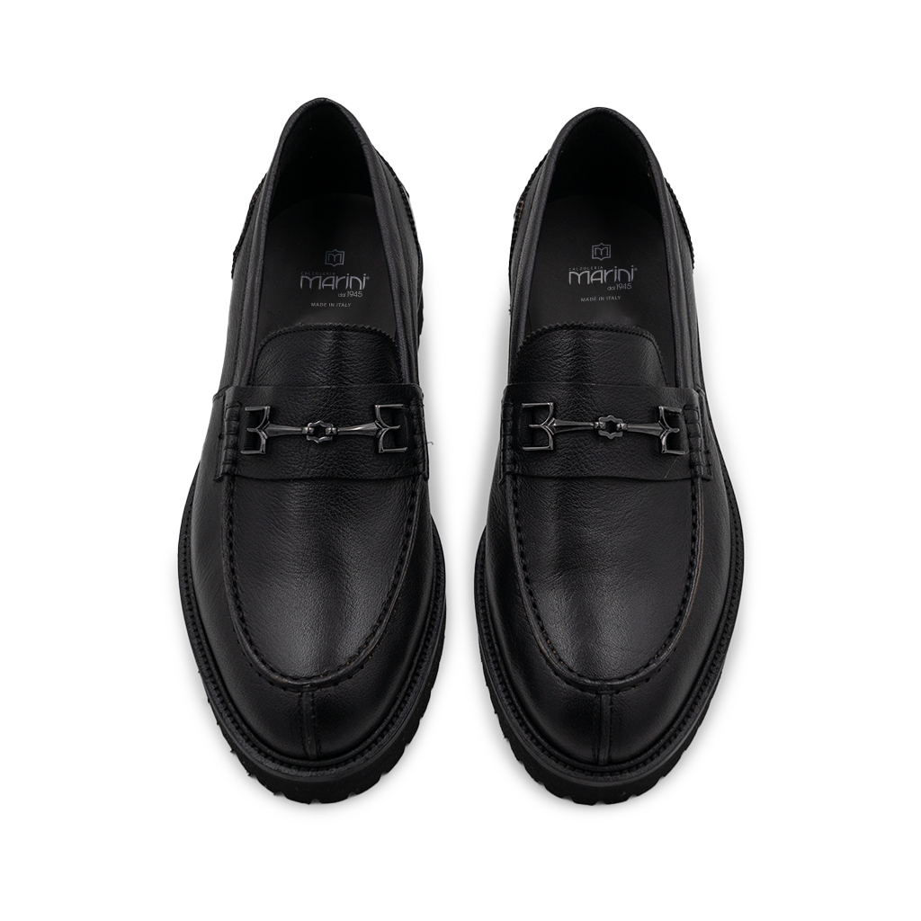 Un’icona di stile senza tempo, questo mocassino college combina raffinatezza e robustezza. Realizzato in pregiata pelle di bufalo nero, si distingue per l’accessorio metallico colore canna di fucile firmato Calzoleria Marini, un dettaglio esclusivo che esalta l’eleganza del design.